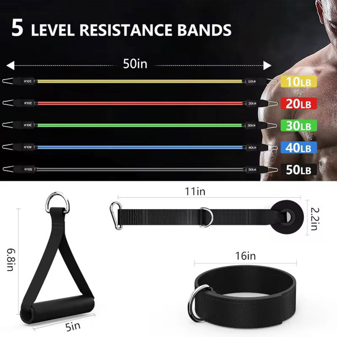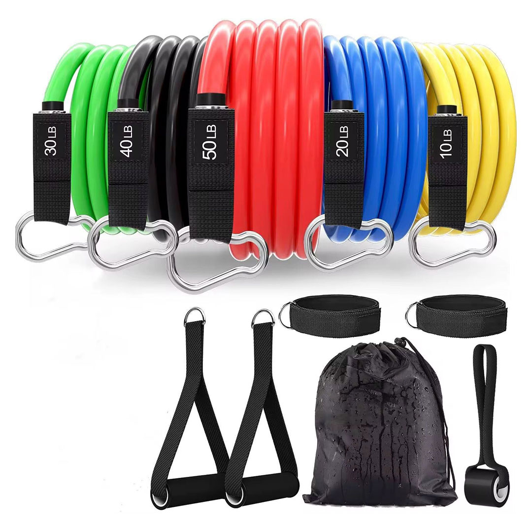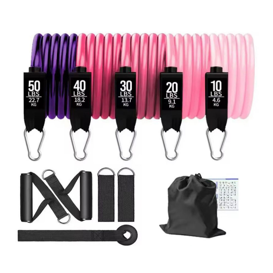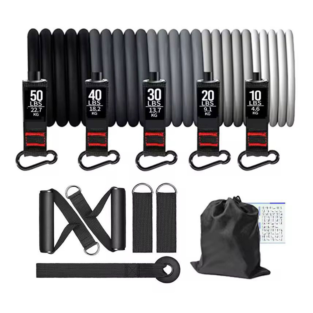 5 stackable resistance bands (4.6, 9.1, 13.6, 18.1, 22.7 kg), 2 cushioned handles, 2 ankle straps, 1 door anchor, 1 carrying bag, exercise guide