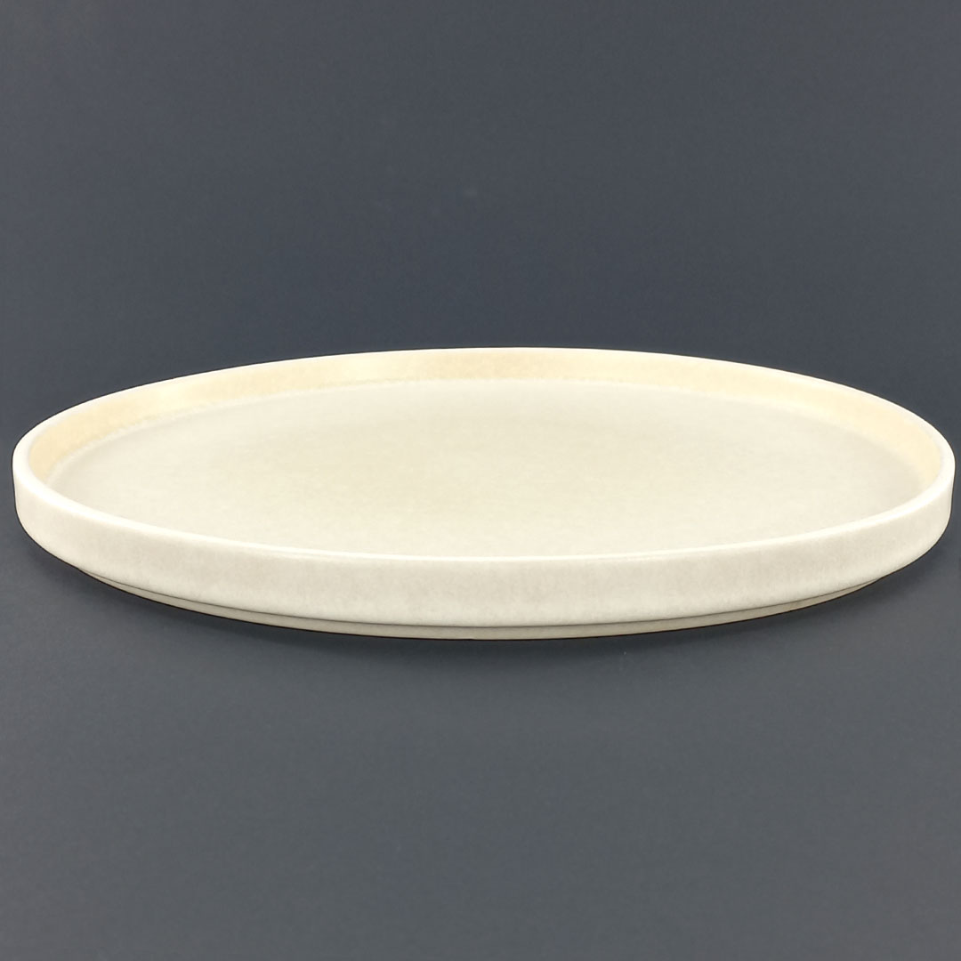 This 26.5cm ceramic dinner plate features a minimalist contemporary design defined by its smooth, matte beige finish and clean silhouette. Crafted with a spacious, flat dining surface, it is framed by a distinct, low profile vertical rim that adds both structural interest and practical containment for sauces. The ceramic glaze offers a soft, creamy tonality with a non reflective surface, creating an understated and modern aesthetic that allows the colors of the food to stand out.