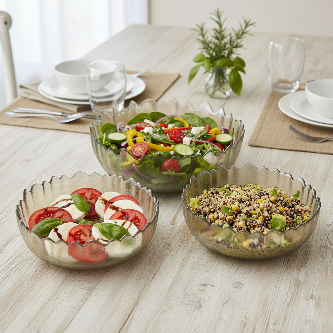 Featuring a unique scalloped edge design and a beautiful reflective finish, these bowls are perfect for serving salads, fruits, or desserts. The set includes one large bowl and two smaller bowls, making it versatile for various serving needs.