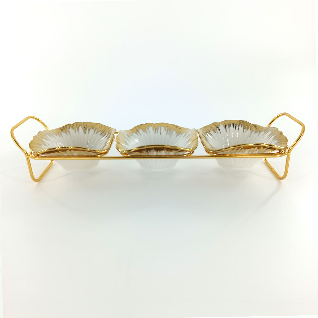 Add a touch of luxury to your table with this 3-piece ceramic bowl set. Each bowl is designed with a floral-inspired shape and finished with a shimmering golden rim, making it both elegant and eye-catching. The bowls sit neatly in a golden metal holder with side handles for easy serving, perfect for appetisers, dips, sauces, or sweets.