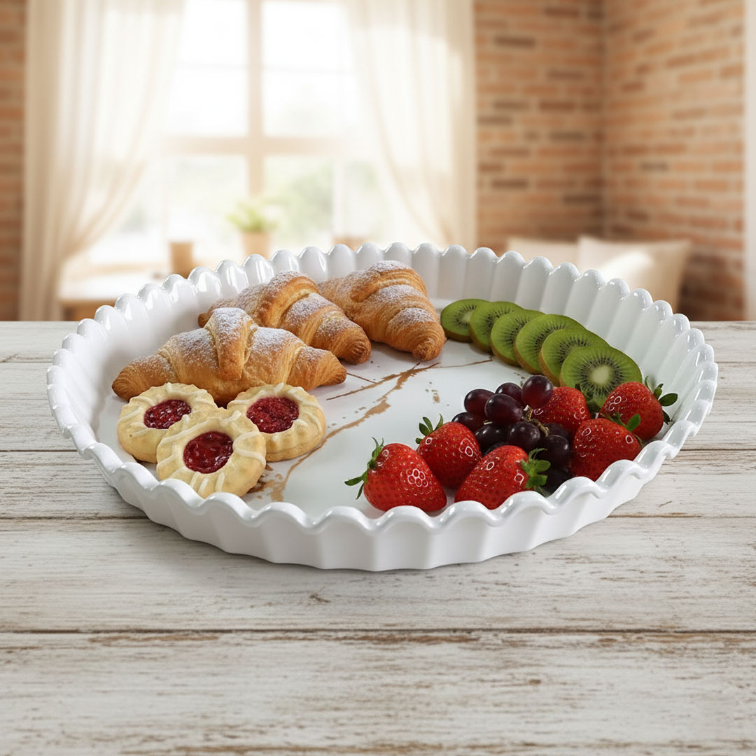 A stylish round serving tray that looks ceramic but is light and easy to handle. Made from durable melamine with a glossy finish and gold marble pattern, it's perfect for serving drinks, snacks, or desserts at the table. The scalloped edge adds a decorative touch while helping to keep items in place.