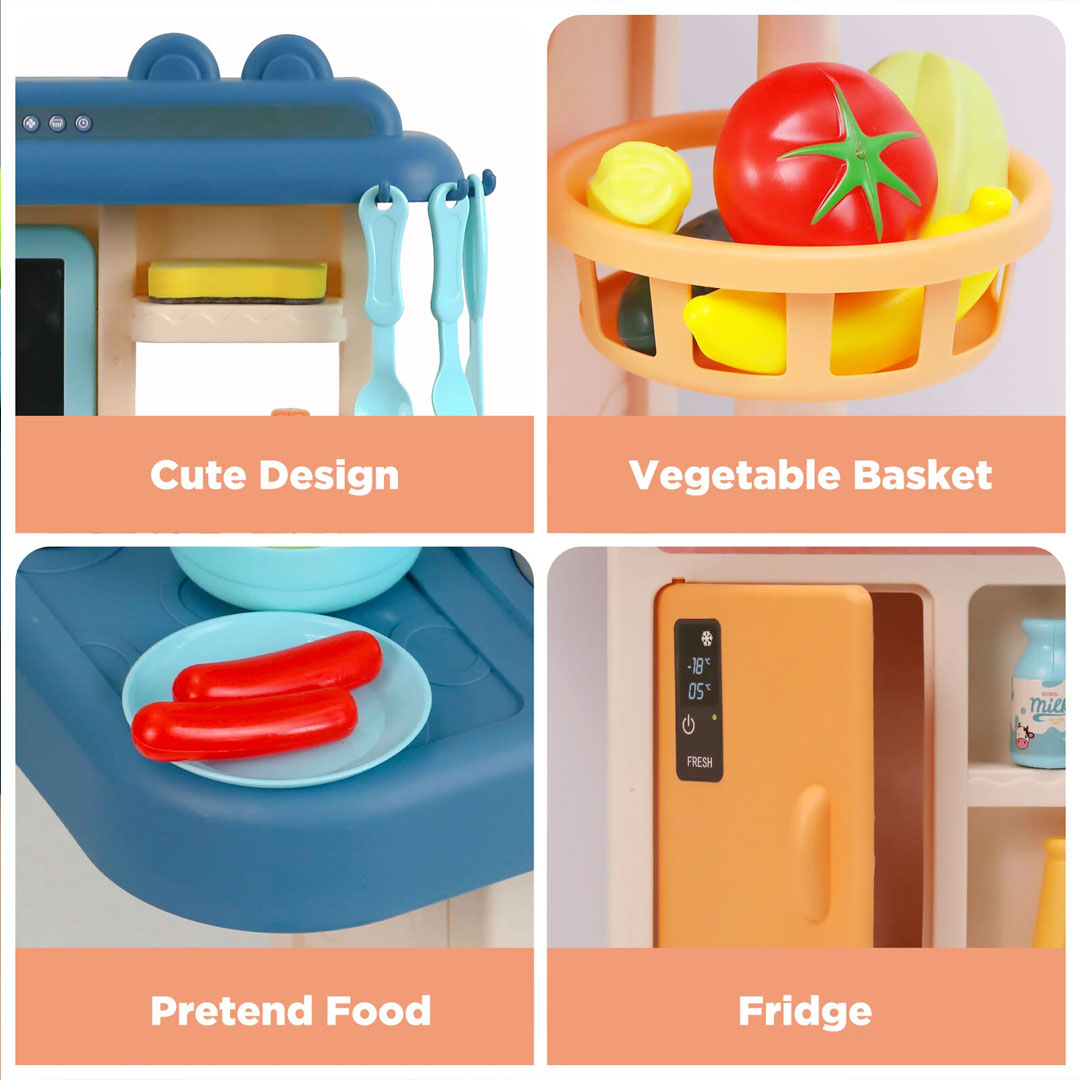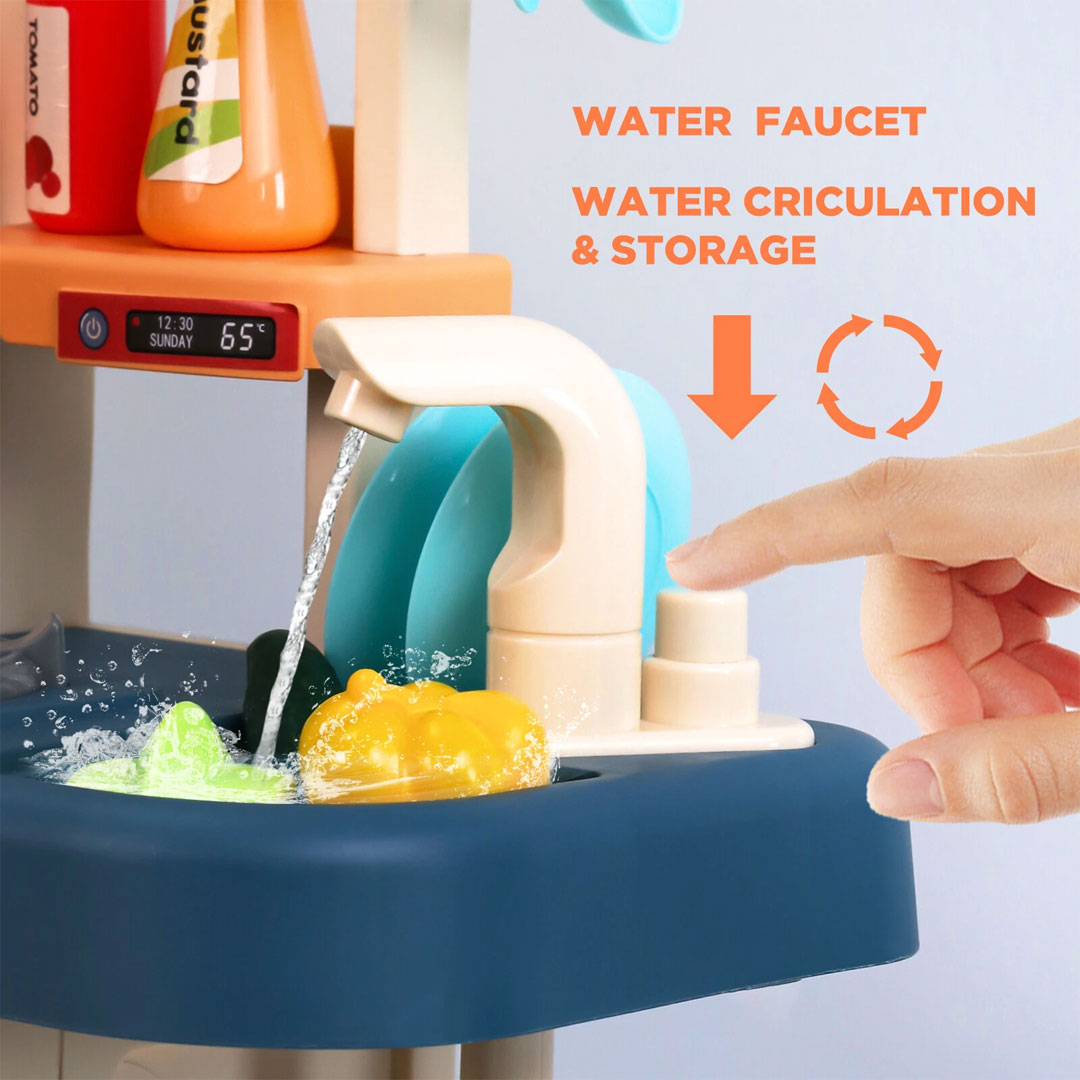 - Real Running Water Sink: Press the pump and actual water flows from the faucet into the sink basin. A built in circulation system stores and recycles the water, so little ones can wash vegetables, rinse plates, and play at the sink just like in a real kitchen.