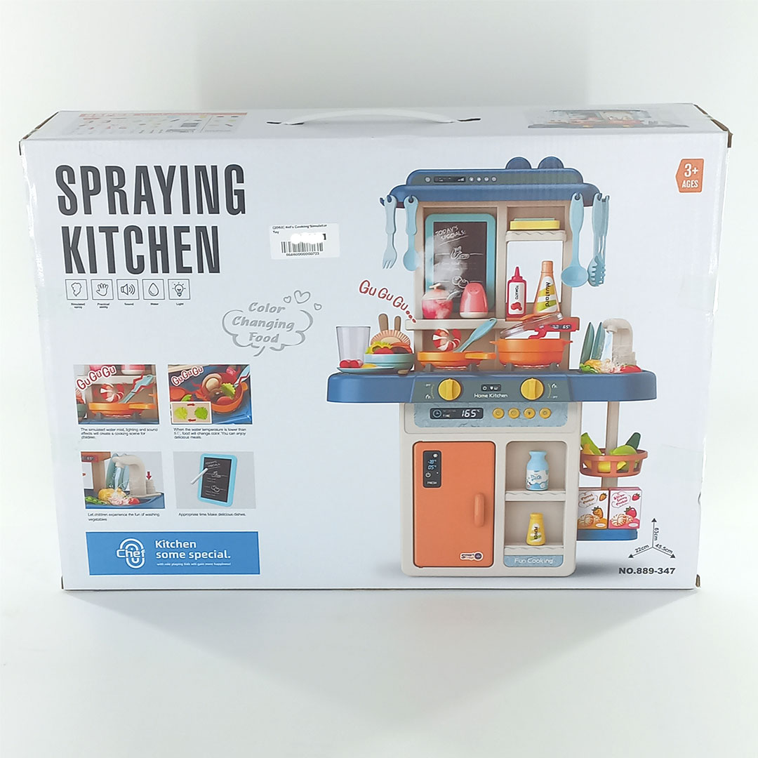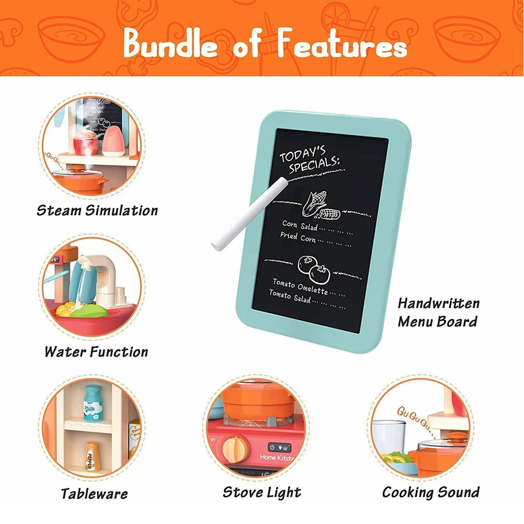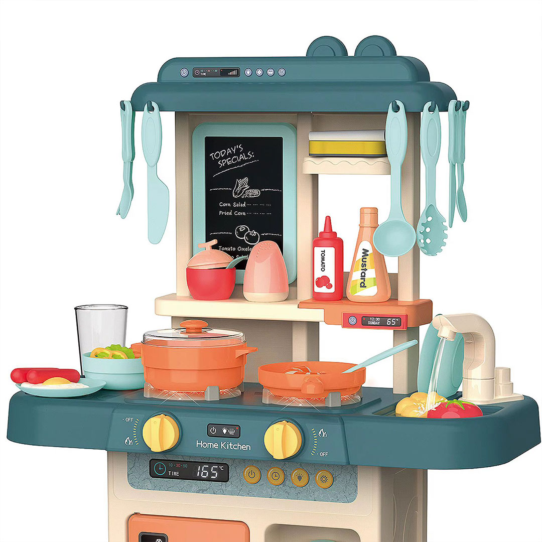 Most play kitchens just sit there looking colourful. This kitchen play set actually does something, the faucet runs real water, the stove lights up and "bubbles" with steam simulation.