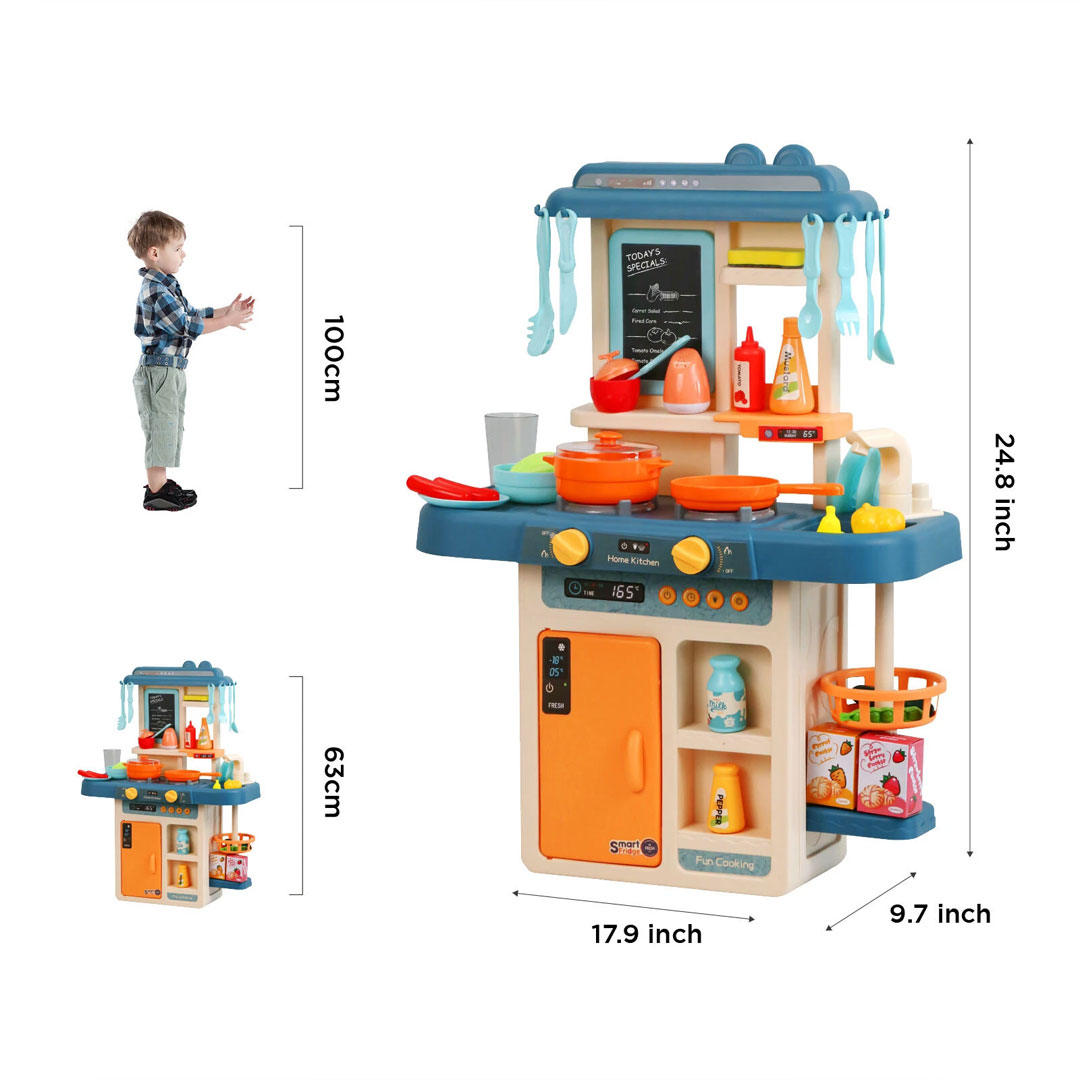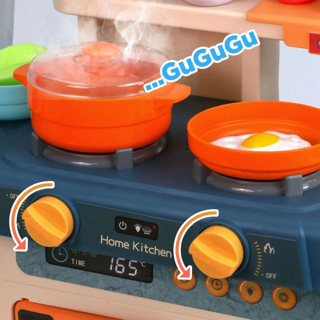 - Steam Simulation with Cooking Sounds: Turn the stove knobs and the pot "bubbles" with simulated steam while the kitchen plays a gurgling cooking sound. The stove also has a working light and a digital display showing temperature and time, making it feel like the real thing.
