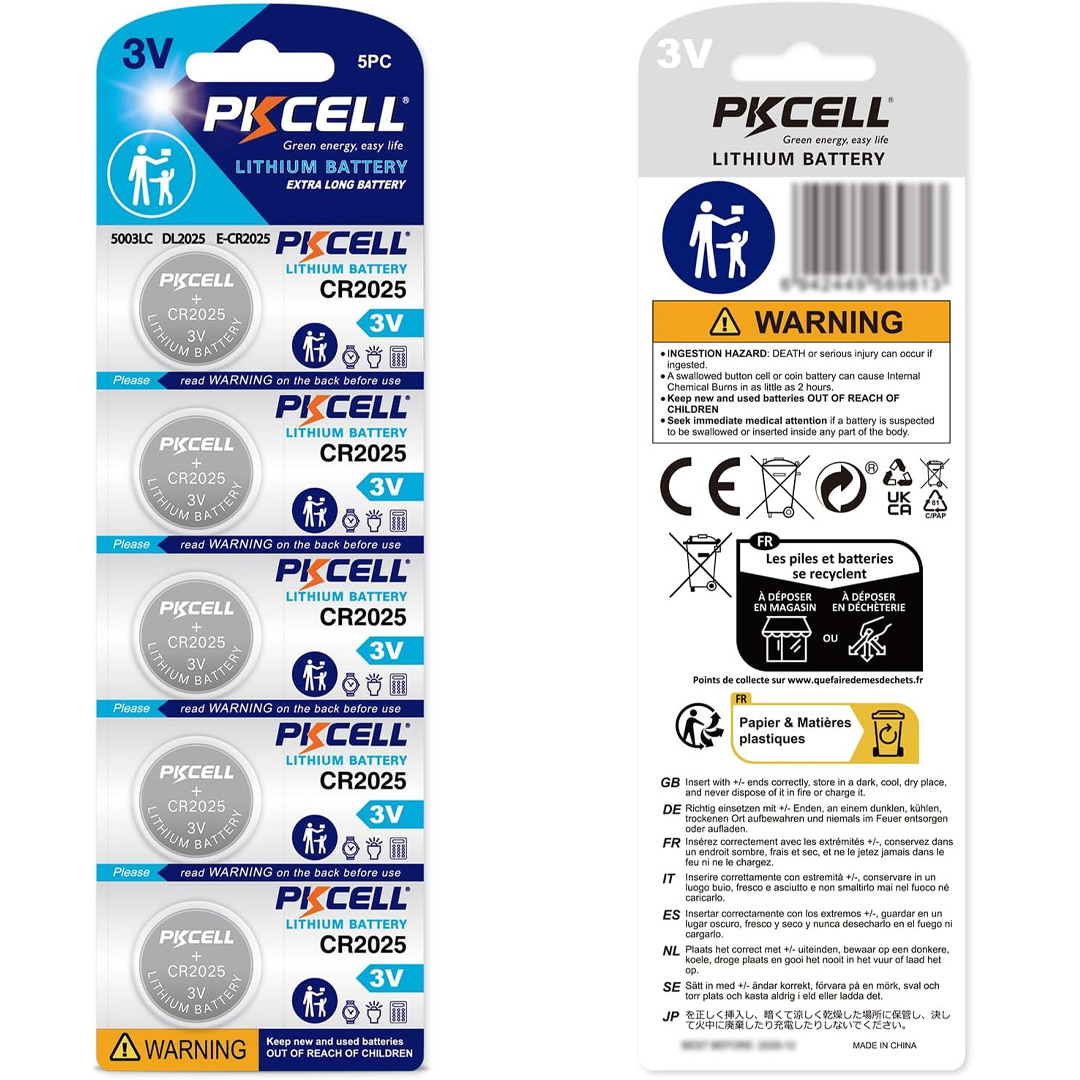 What's Included: 1 x Blister card containing 5 PKCELL CR2025 3V Lithium Batteries.