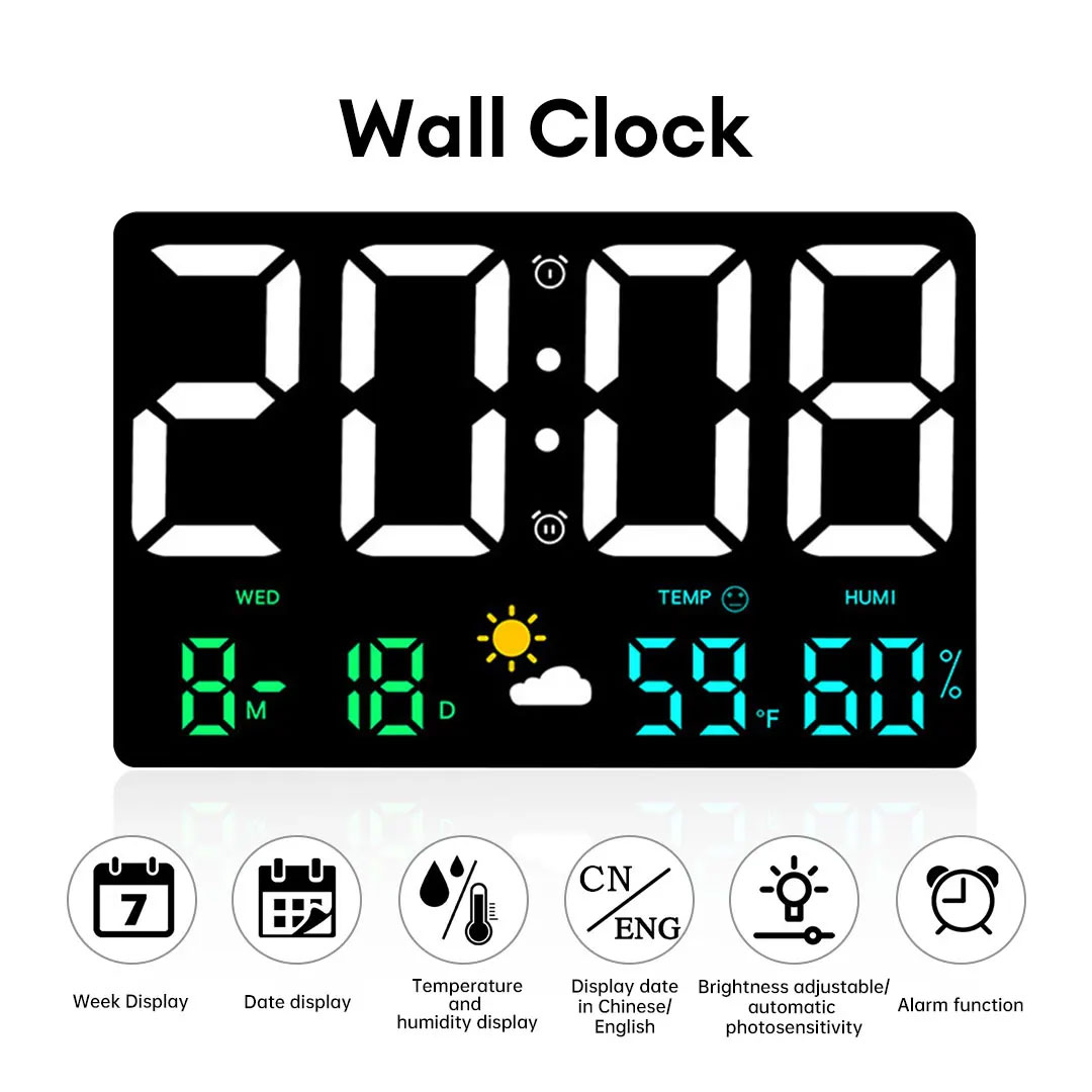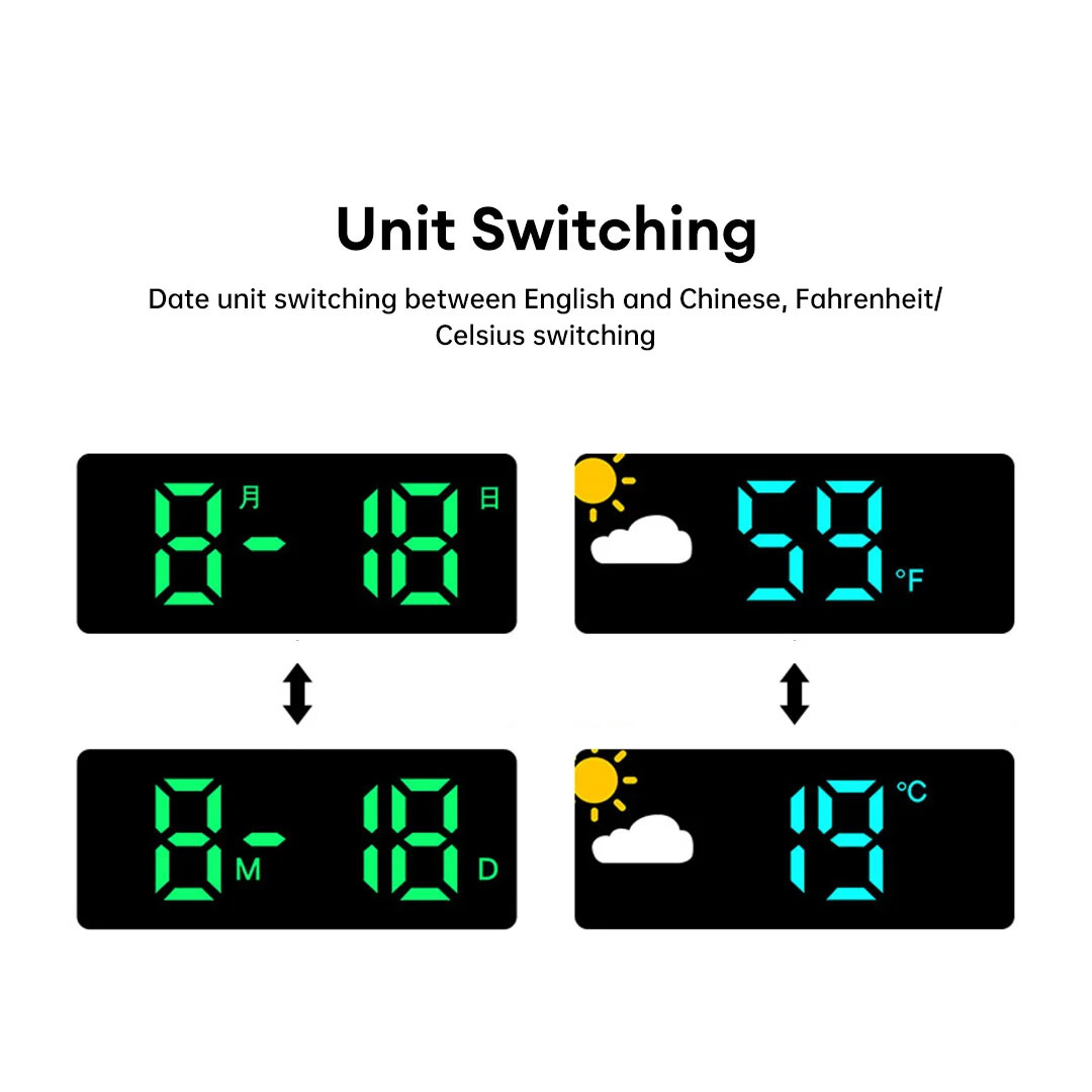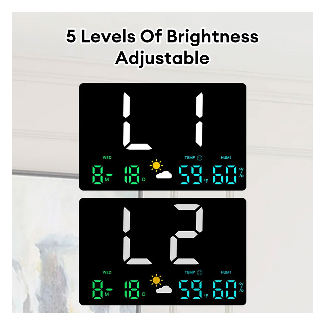 - All Your Info in One Glance: Large time display (white LEDs), current temperature in Fahrenheit or Celsius, humidity percentage, plus day of the week and date. The weather icon gives you instant conditions without checking your phone.