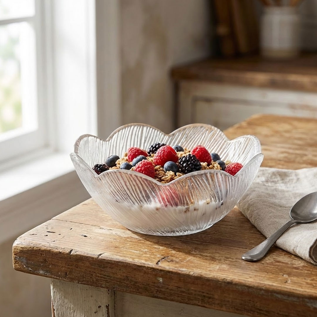 This 13.5cm diameter and 5.5cm depth hold about one generous serving, enough for a breakfast bowl, side salad, or individual dessert without feeling oversized or wasteful. Frosted glass finish diffuses light softly while the vertical ribbed texture creates subtle dimension that standard smooth bowls can't match. 13.5cm diameter × 5.5cm height
