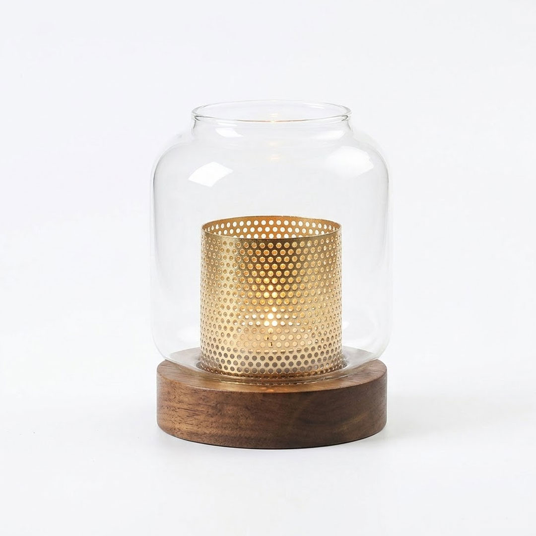 Glass Candle Holder with Perforated Gold Insert & Wood Base