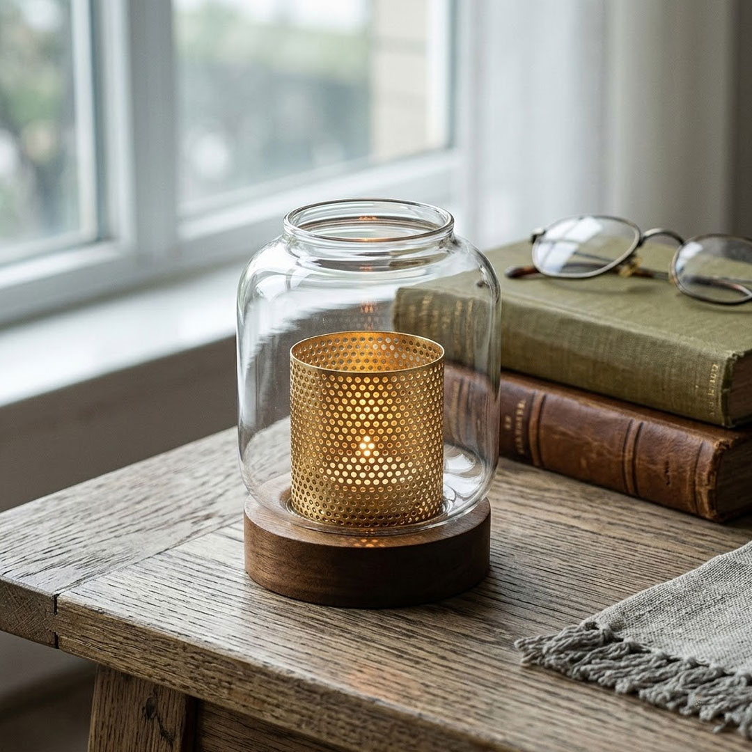 - Three-Material Build That Actually Looks Expensive: Clear glass, gold perforated metal, and a dark wood base sit together in a way that reads as intentional and refined, not like three mismatched parts.