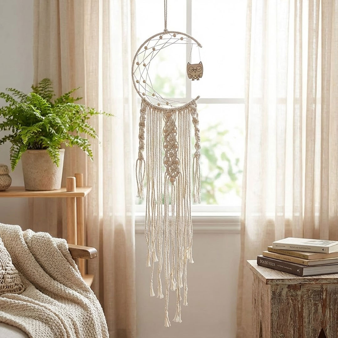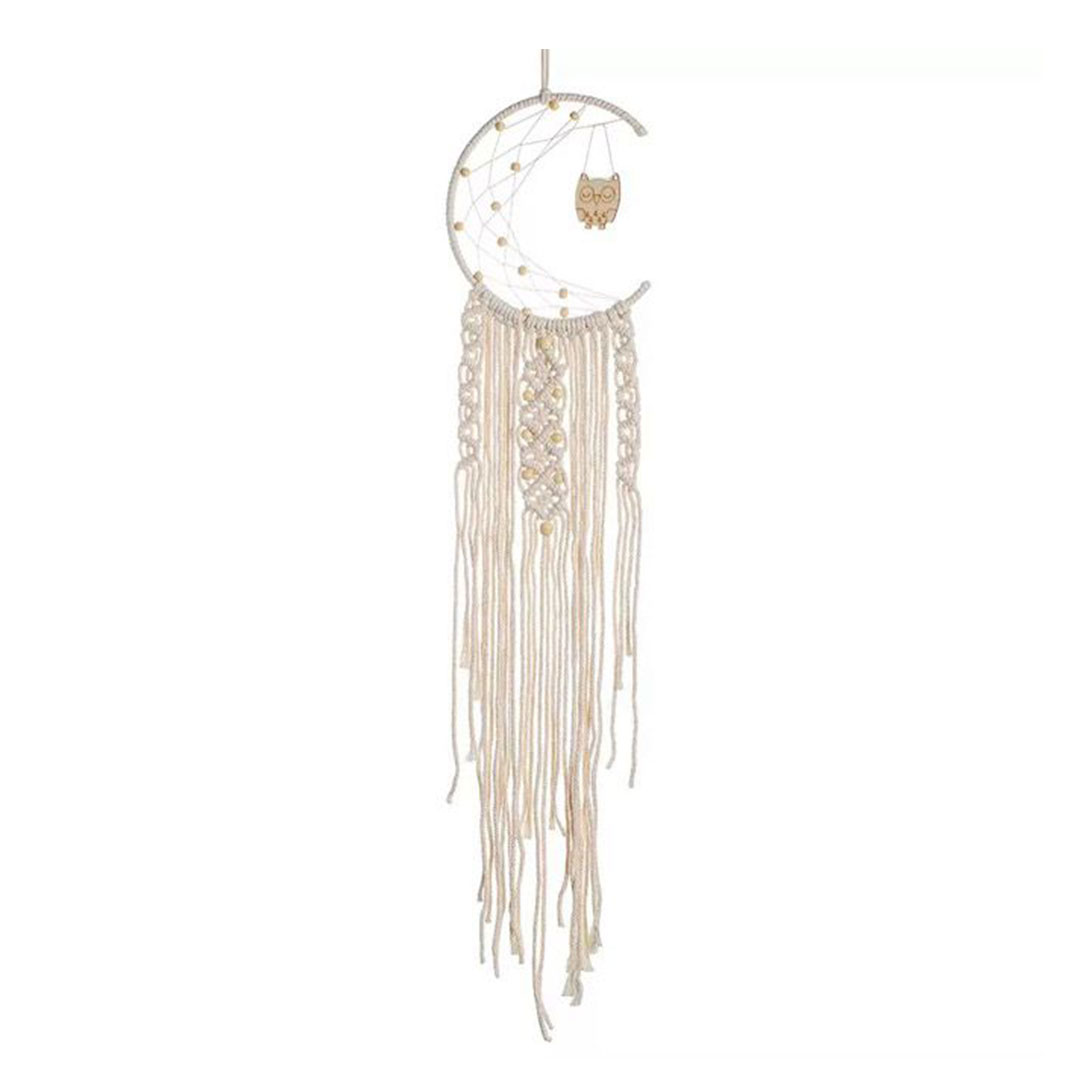 That bare wall in your bedroom or reading nook has been waiting for something like this. The crescent moon frame, carved wooden owl, and cascading cotton fringe come together in a way that feels curated, not like something you grabbed off a shelf.
