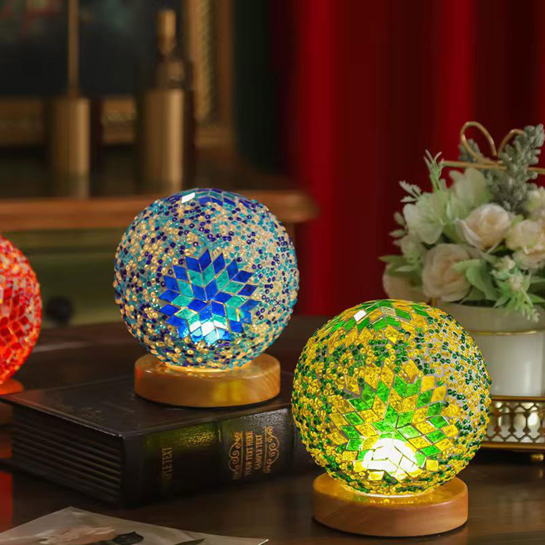A bare shelf or plain bedside table does nothing for a room. This mosaic ball table lamp earns its spot the moment it goes on, casting warm, jewel toned light through hundreds of hand-set stained glass beads.