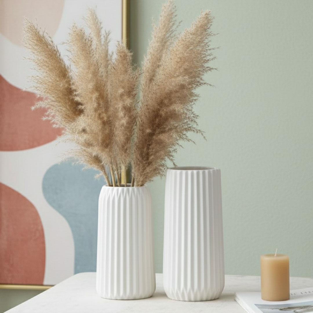 Enhance your home decor with this set of two ribbed ceramic vases, available in small and large sizes. The small vase, standing at 20cm tall, is perfect for subtle accents or small floral arrangements, while the larger vase at 23cm adds a bold statement to any room. Both vases feature a sleek white finish with a ribbed texture, bringing a modern, minimalist touch to your space.