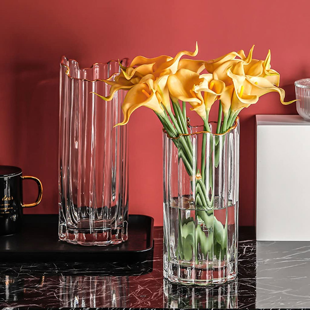 This ribbed glass vase combines sleek simplicity with a touch of elegance, featuring vertical ridges and a gold-rimmed edge. Its clean and modern design makes it a standout piece for showcasing your favorite flowers.