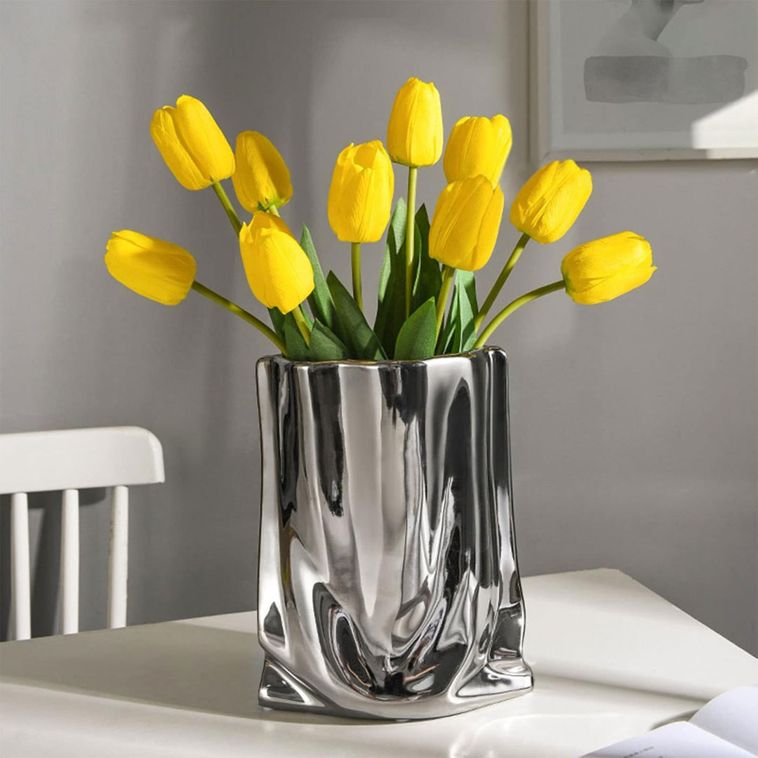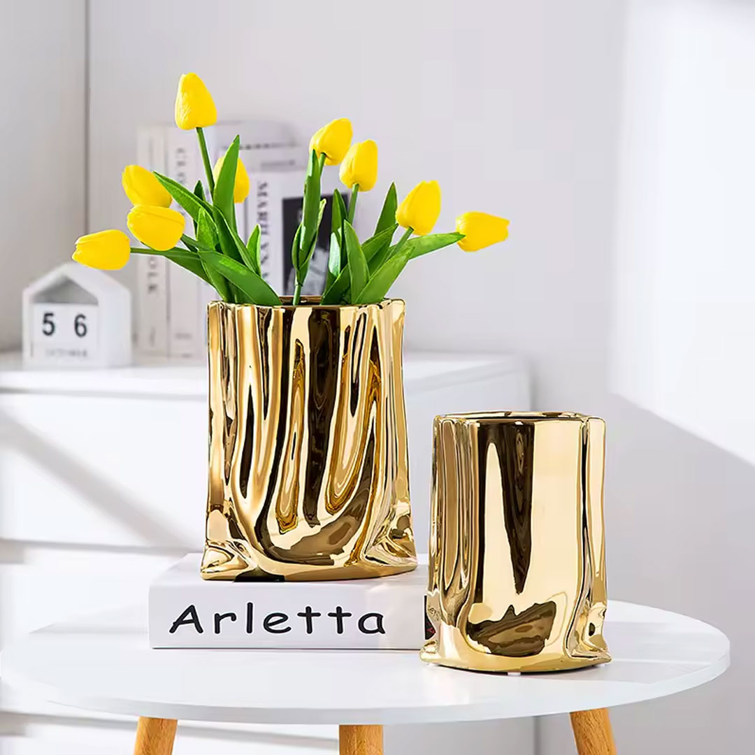 This unique ceramic vase brings a modern edge to your decor with its striking metallic finish and crumpled design, creating an illusion of movement and fluidity. Perfect for adding a contemporary flair to your space.