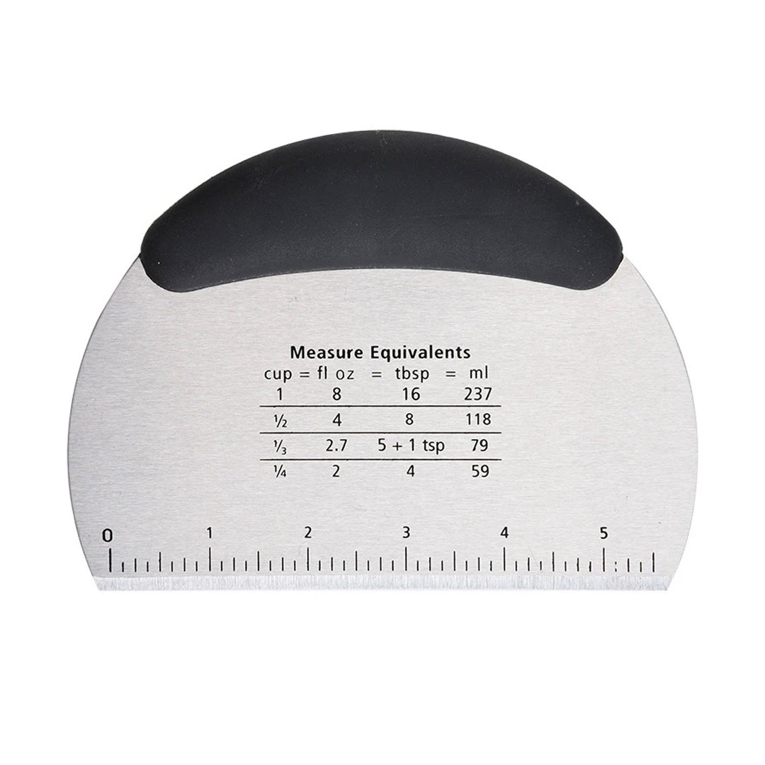 This stainless steel dough scraper puts a measurement conversion chart and ruler directly on the blade, cutting out the back and forth between your work surface and the measuring cup drawer. Portion dough, check measurements, and scrape your counter clean with one tool that stays in your hand the whole time.