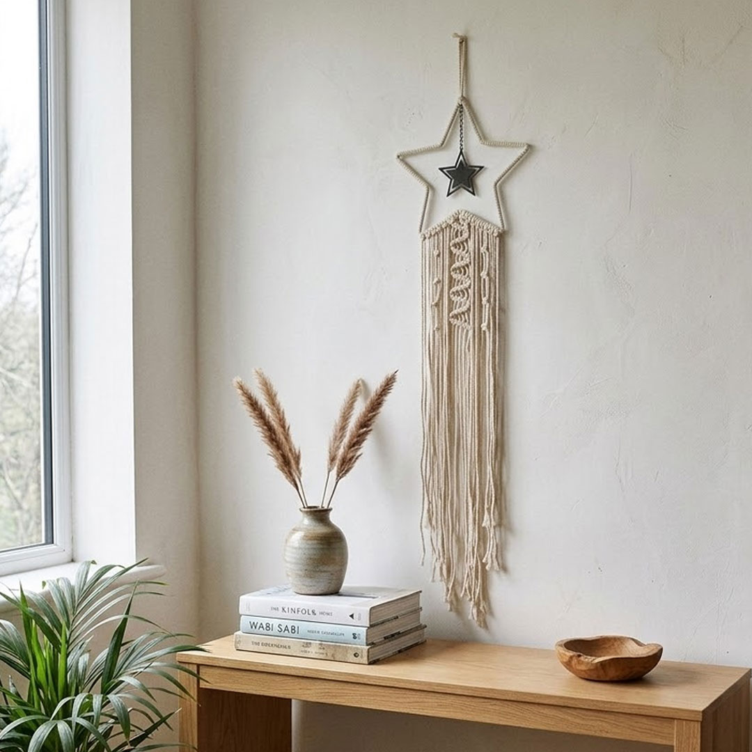 That bare wall above your bed or reading nook doesn't need a gallery frame, sometimes a single well chosen piece does more. This star macrame wall hanging brings warmth and texture to any room without trying too hard.