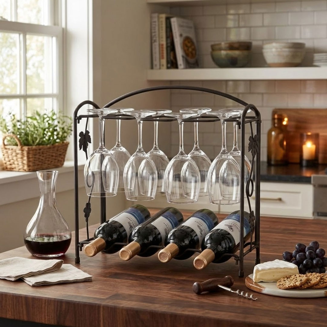 Most wine racks make you choose between storing bottles or glasses. This one handles both, keeping everything organized in one compact, countertop-friendly unit.