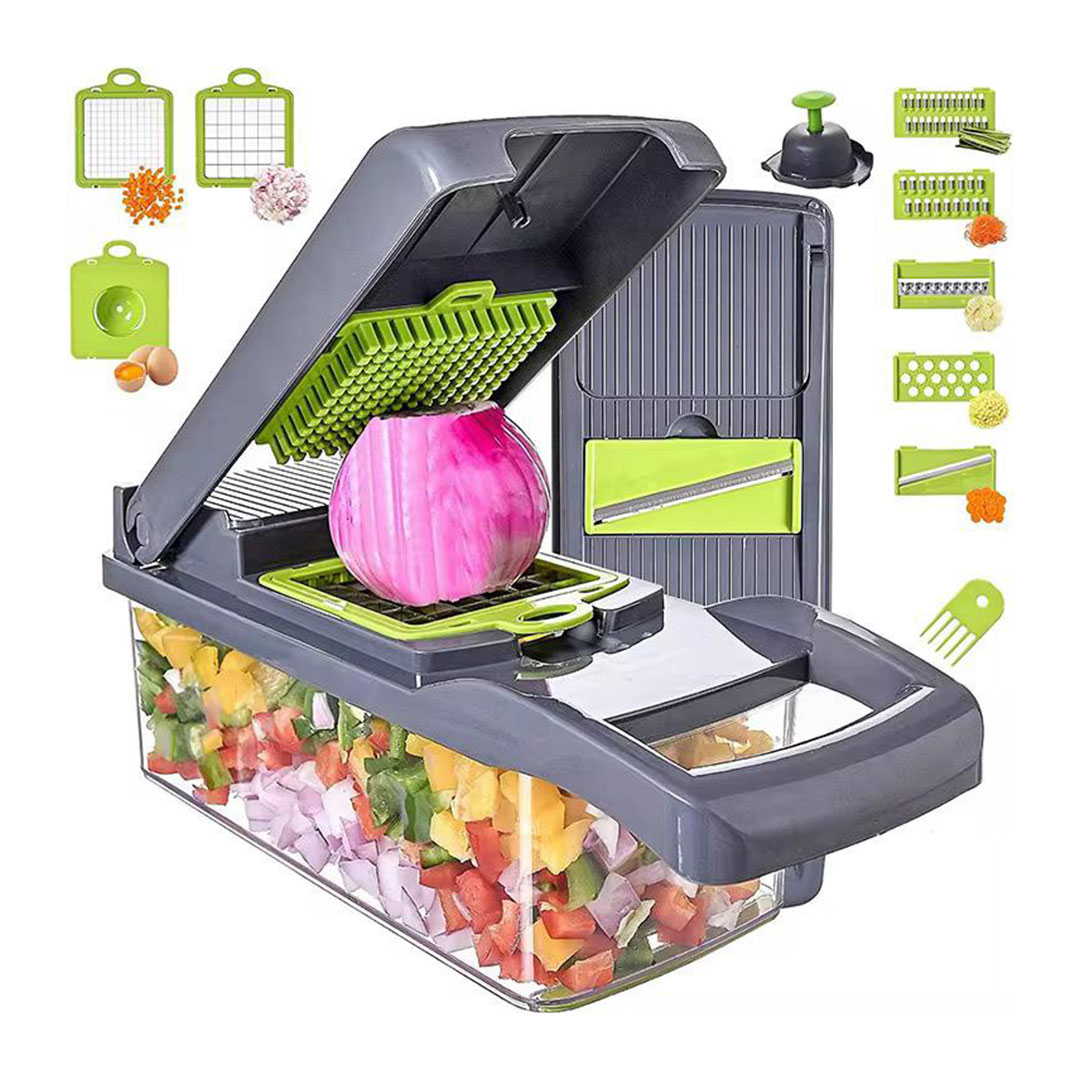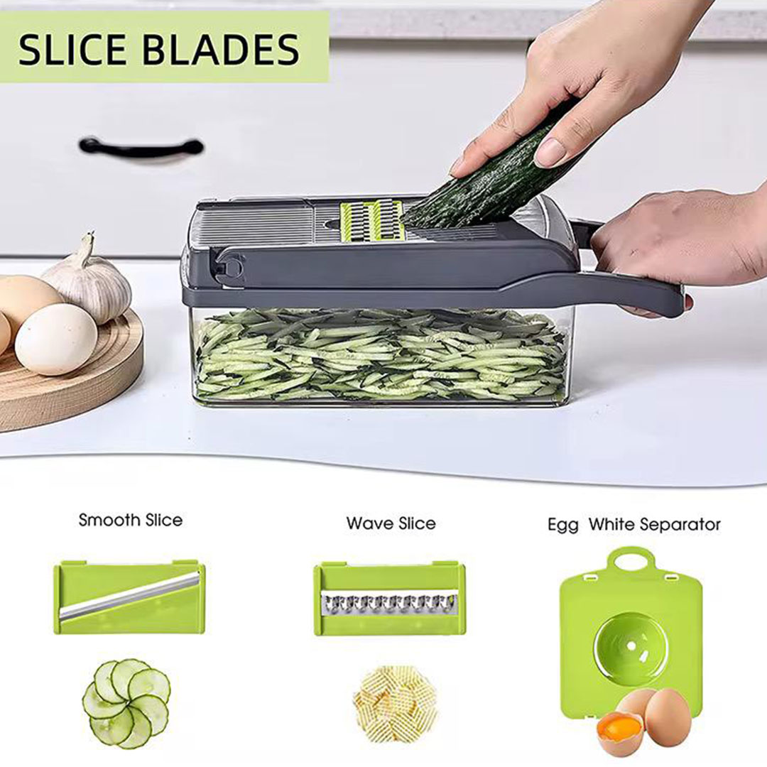 - Eight Blades, One Tool. Swap between large dice, small dice, smooth slice, wave slice, julienne, shredding, ricing, and an egg white separator. Each blade clicks in and out without tools.