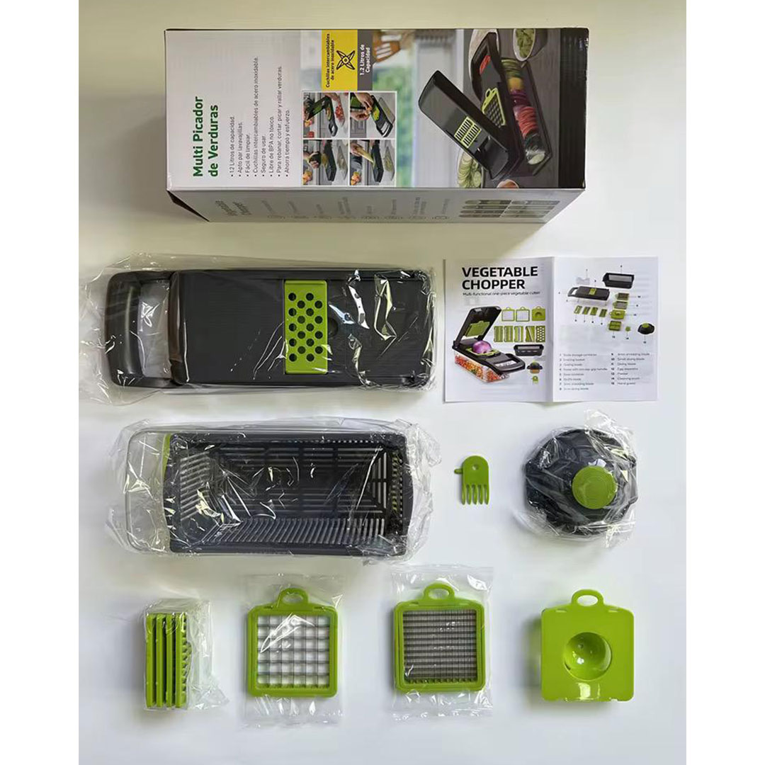 Main chopper body with 1.2L collection container, large dice blade, small dice blade, smooth slicing blade, wave slicing blade, julienne blade, shredding blade, ricing blade, egg white separator, food holder grip, cleaning comb, and instruction booklet.