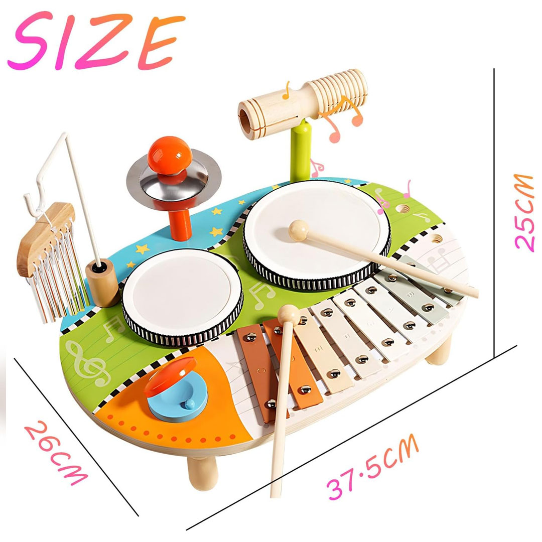 - Seven Instruments, Zero Clutter: Includes two drums, brass cymbal, 8-note xylophone, wind chime, castanet, and rattle so you're not tripping over scattered toys when they lose interest in one sound and move to the next.